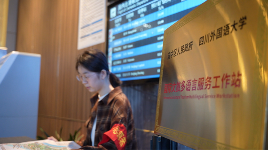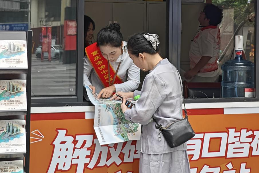 Le 1er octobre au matin, au Centre d’accueil multilingue pour le tourisme et la culture, situé dans le quartier de Chaotianmen, Deng Yaling, étudiante à SISU, accueillait un touriste venu de Corée du Sud. Elle lui présentait la carte touristique illustrée du district de Yuzhong, réalisée en multilangues sous la coordination du Comité du tourisme et de la culture du district, en leur faisant découvrir les principaux sites touristiques de Chongqing.