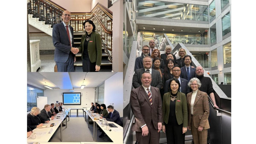 Le 26 novembre, la délégation a visité l'Université Queen Mary de Londres. Mme GOU Chaoli et la Vice-Présidente de l'université, Mme Helen Bailey, ont partagé leurs visions respectives en matière de stratégie d'internationalisation, de formation des talents à dimension internationale et de collaboration scientifique internationale. Les discussions se sont concentrées sur les projets de formation conjointe au niveau licence (« 2+2 »), le programme intégré licence-master « 3+1 », la coopération en recherche académique, ainsi que les échanges culturels.